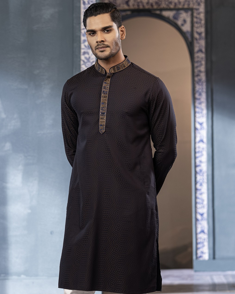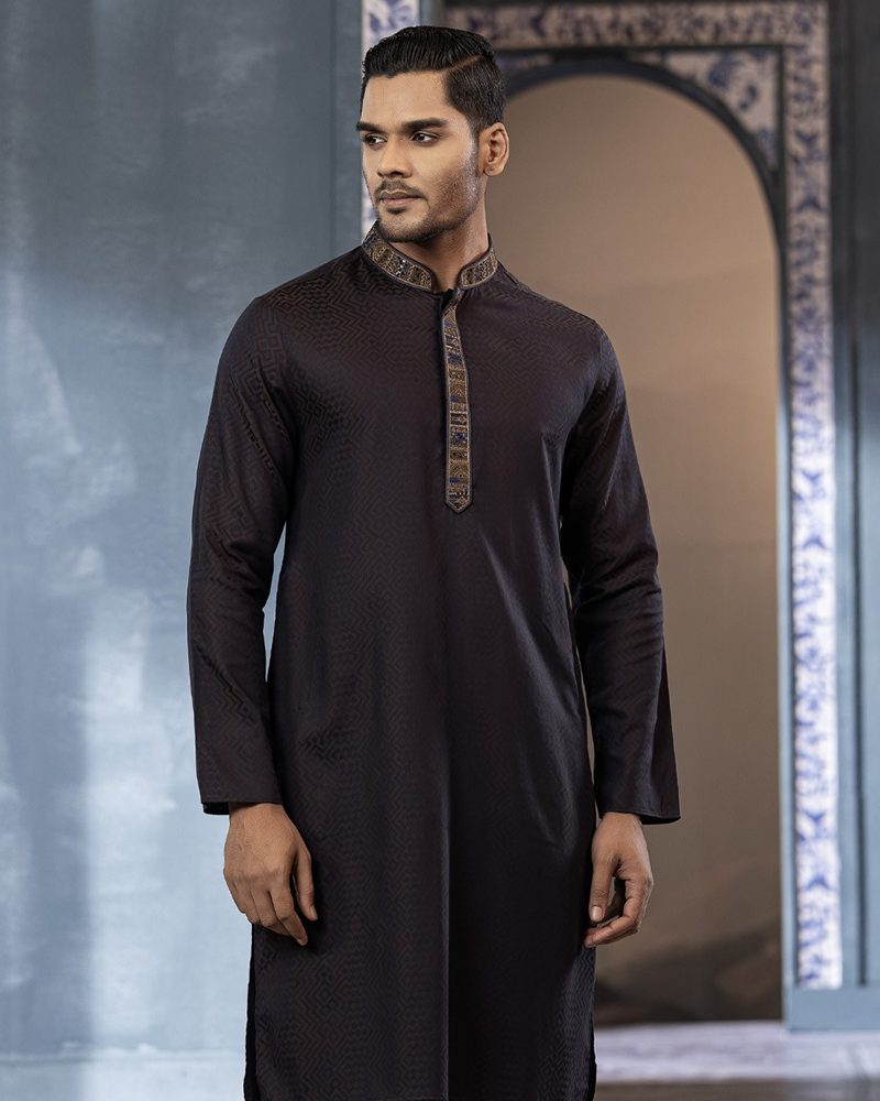This mens black panjabi is crafted from luxurious bamboo silk, offering a sleek and comfortable slim fit. Designed with a contrast collar and placket, it features stylish snap buttons for a modern touch. Perfect for festive occasions or elegant gatherings, this Panjabi blend sophistication with contemporary style.